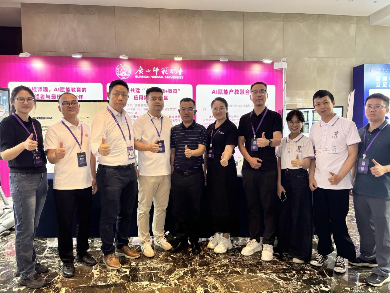 我校展位亮点纷呈,来咨询参观的人络绎不绝。广州乐庚科技的“小乐秒阅”系统,通过视频与课例展示智能阅卷对教学效率的提升作用,该项目由我校陆声链教授团队深度参与研发;苏州凤凰数智的全息仓数字人及多款教育AI硬件,为参会者提供沉浸式互动体验,其“全息仓数字人+教育”项目由我校唐剑岚教授团队参与内容核心制作;面壁智能带来的“学生全功能智能体学伴‘模搭’”,直观演示AI与教育教学的深度融合,将与我校优化广西本土化智能伴学系统提供顶级技术支持;中国—东盟数字科技研究院自主研发的“TAID飞屏互动一体机”,为大家带来了“桂爱才”平台功能与企业风采。