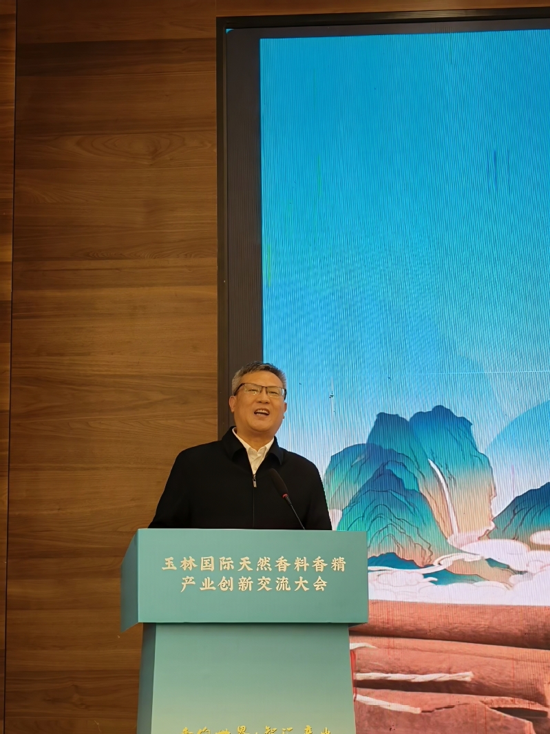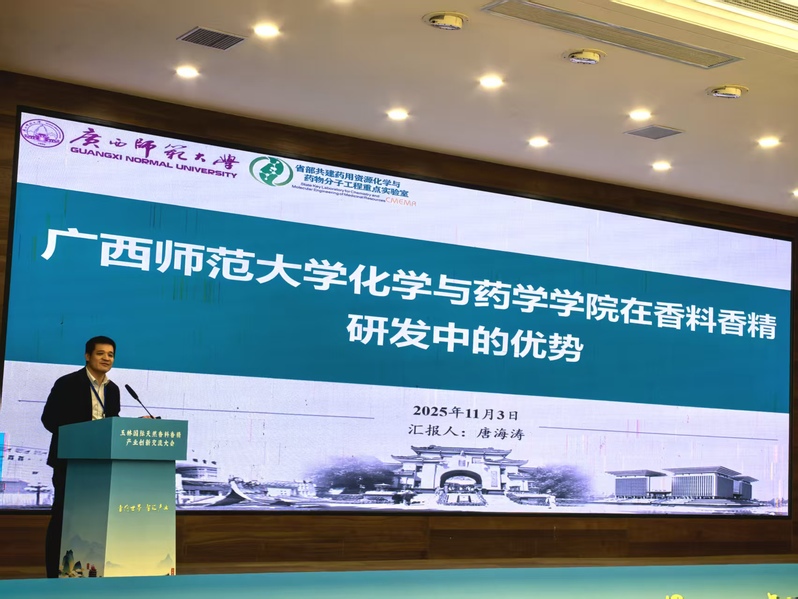 在玉林国际天然香料香精产业创新交流大会上,宋树祥副校长作了致辞,化学与药学学院唐海涛教授应邀作题为“广西师范大学化学与药学学院在香料香精中的研发优势”的主旨报告。宋树祥副校长与张海鹏副市长共同为“广西师范大学科技成果转移转化玉林分中心”揭牌。